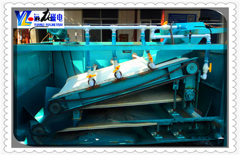 平板式有色金屬磁選機(jī)_平板式有色金屬磁選機(jī)分選運(yùn)行視頻,平板磁選機(jī)采用的帶式分選結(jié)構(gòu),在整個(gè)的工作區(qū)域從進(jìn)料到出料,物料在皮帶的的帶動(dòng)下,可對(duì)物料進(jìn)行多次的磁攪拌,同時(shí)在水流的的沖洗作用下,把不含磁的的尾礦除去,帶有磁性的的礦物被皮帶輸送到板選機(jī)的的脫磁區(qū),從而將帶有磁性的的礦物通過脫磁裝置脫掉,來完成選礦的的過程,整機(jī)功率小、處理大,磁場(chǎng)強(qiáng)度高,并達(dá)到很好的的品質(zhì),能夠獲得更大的的效益。